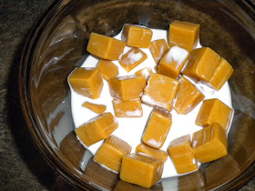 Combine the caramel candies and half & half in a small bowl.  Microwave at 30 second intervals, stirring well, until the caramel is melted.  Stir until smooth.  Cool slightly-- do not refrigerate.
